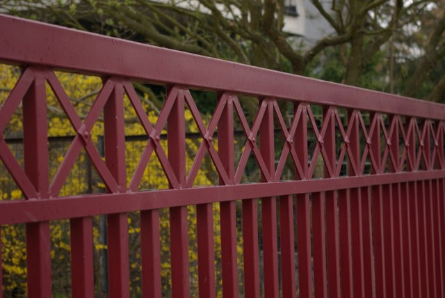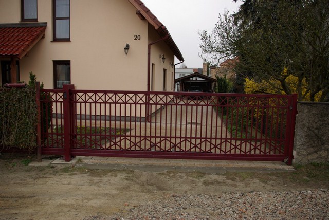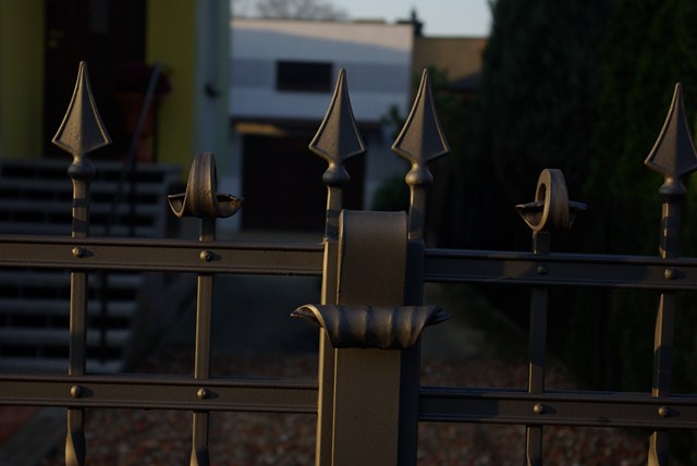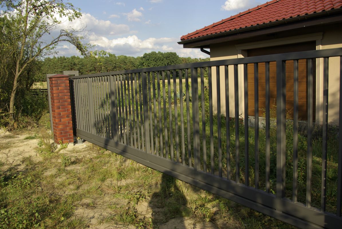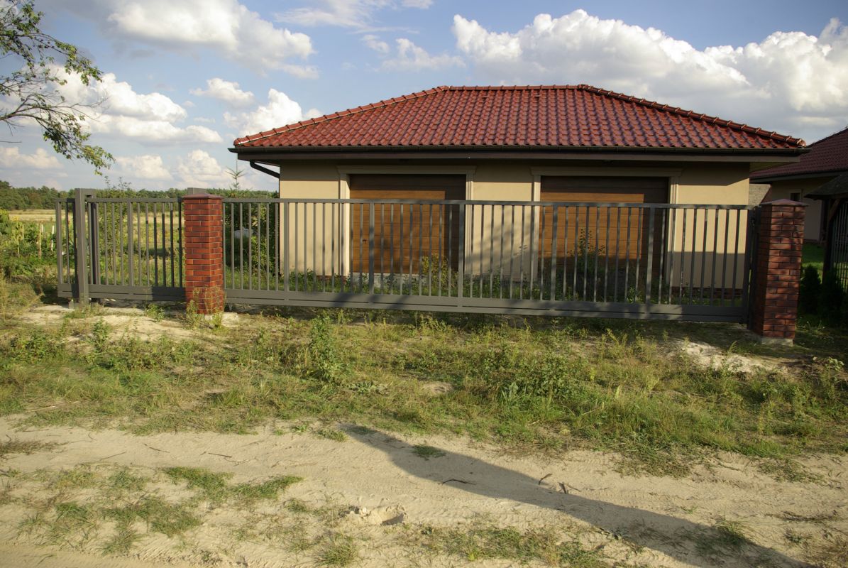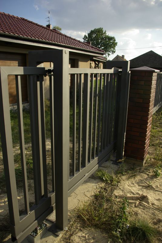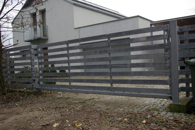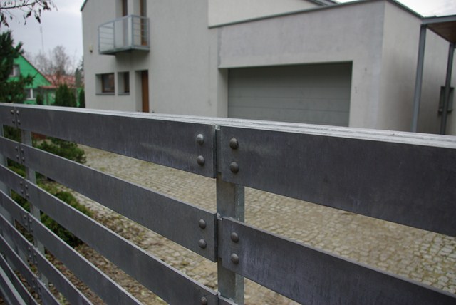 Brama w surowym ocynku bardzo minimalistyczna w stylu podobnie jak całe ogrodzenie. Warto zwrócić uwagę na detale w postać nitów na łączeniach.